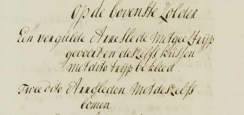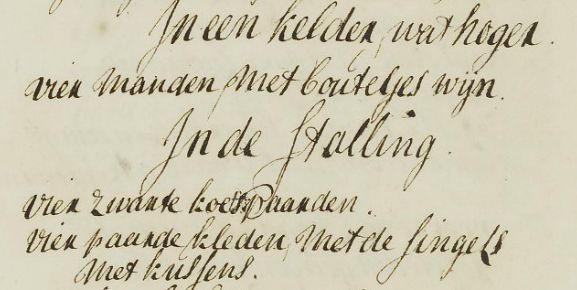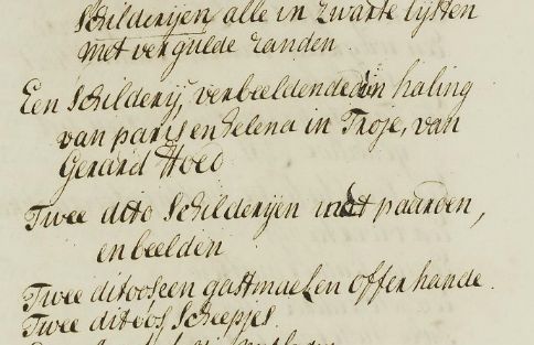 Fragmenten uit de boedelinventaris: onder meer wijn, een kostbaar zadel, een vergulde arrenslee en een schilderij van Gerard Hoed.