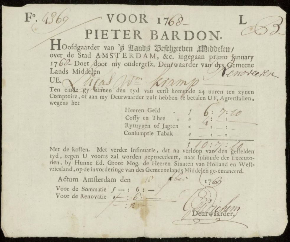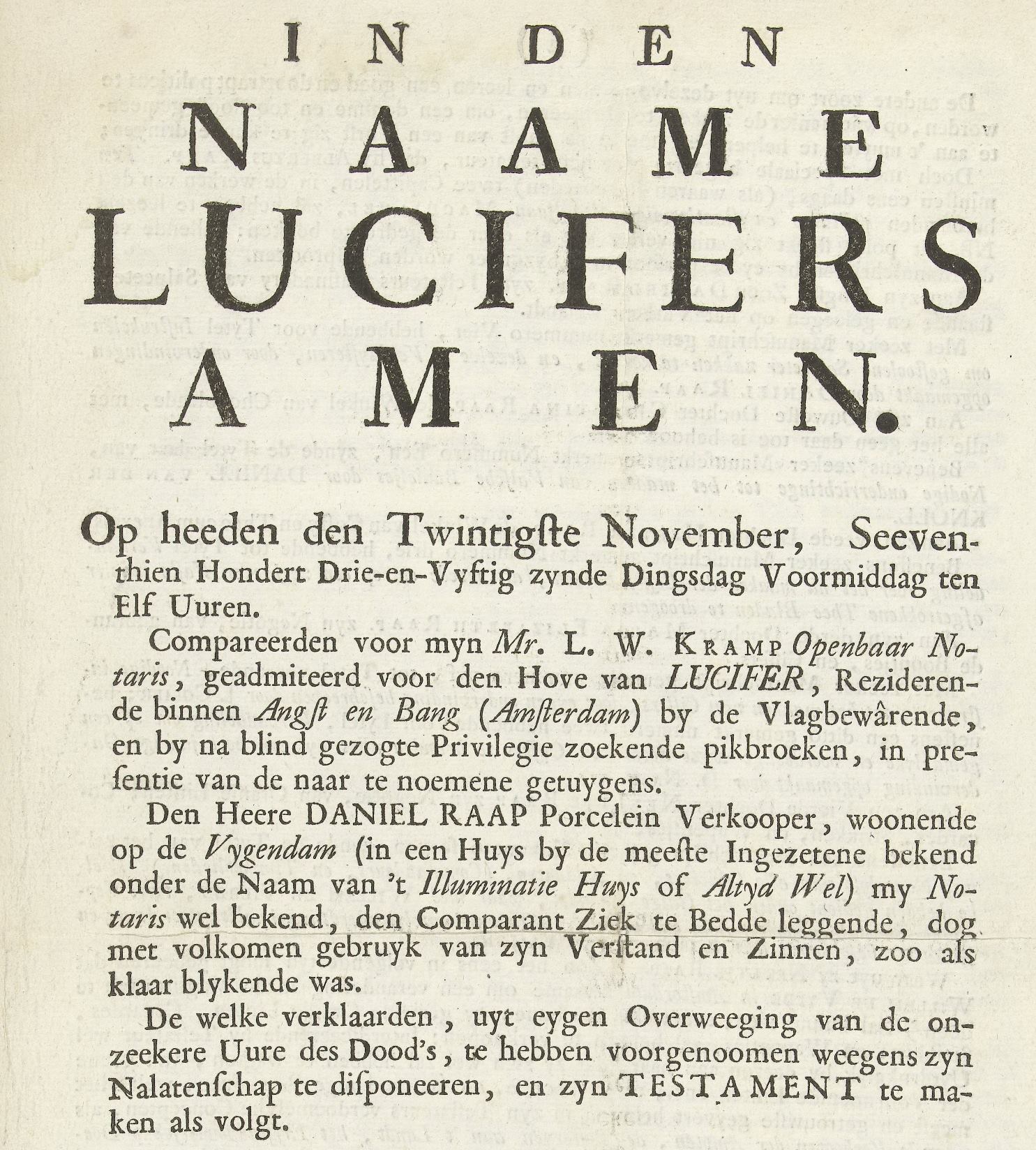 - Het eerste vervalste testament SAA 5075 inv.nr. 364, 4-02-1776. Het tweede testament werd gepasseerd op 14-02-1777 maar is waarschijnlijk vernietigd gezien deze akte niet te vinden is in het archief.