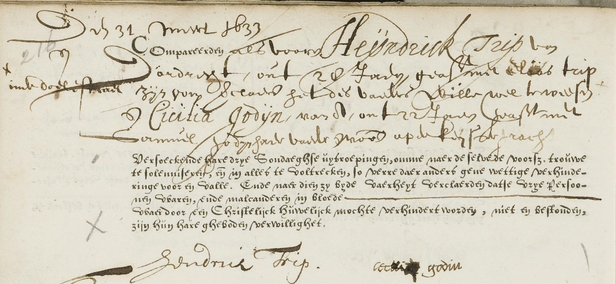 Alle bruidsparen uit het jaar 1633 en 1634 in Amsterdam zijn gelezen. Dit kon vrij vlot aangezien de meeste bruidegoms, de eerste regel uit de akte, binnen enkele seconden geëlimineerd konden worden als 'niet interessant'. We mogen aannemen dat de geschilderde jongeman, uit een vermogend milieu komt. Hierdoor vallen alle bruidegoms met een ambacht, varend beroep, soldaat etc. etc. direct af. De bruidegom woont in een groot huis, waar het schilderij gehangen moet hebben, en woont in een betere buurt. Alle adressen in sloppen en gangen vallen dan ook direct af. De bruidegom is in elk geval jonger dan 30 en hij kan een fatsoenlijke handtekening zetten en zijn bruid naar alle waarschijnlijkheid ook.
