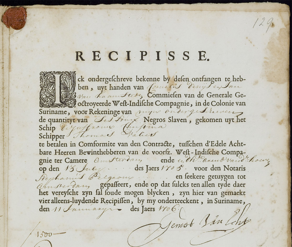 De bovenstaande bon is voor een levering op 13 juli 1705 van zes Afrikanen die met het schip de Juffrouw Christina naar Suriname vervoerd zijn. De zes Afrikanen werden voor 1500 gulden verkocht aan Gerrit van Egten, dat bedrag werd voldaan door zijn zaakwaarnemer in Amsterdam Arend van der Hoeven. De zes Afrikanen maakten onderdeel uit van een bestelling op 11 januari 1705 van 136 'negros slaven'. Zowel de bestelling als de latere afrekening vonden plaats in het bijzijn van notaris Stephanus Pelgrom, die naast zijn notarispraktijk ook secretaris van de Sociëteit Suriname was.