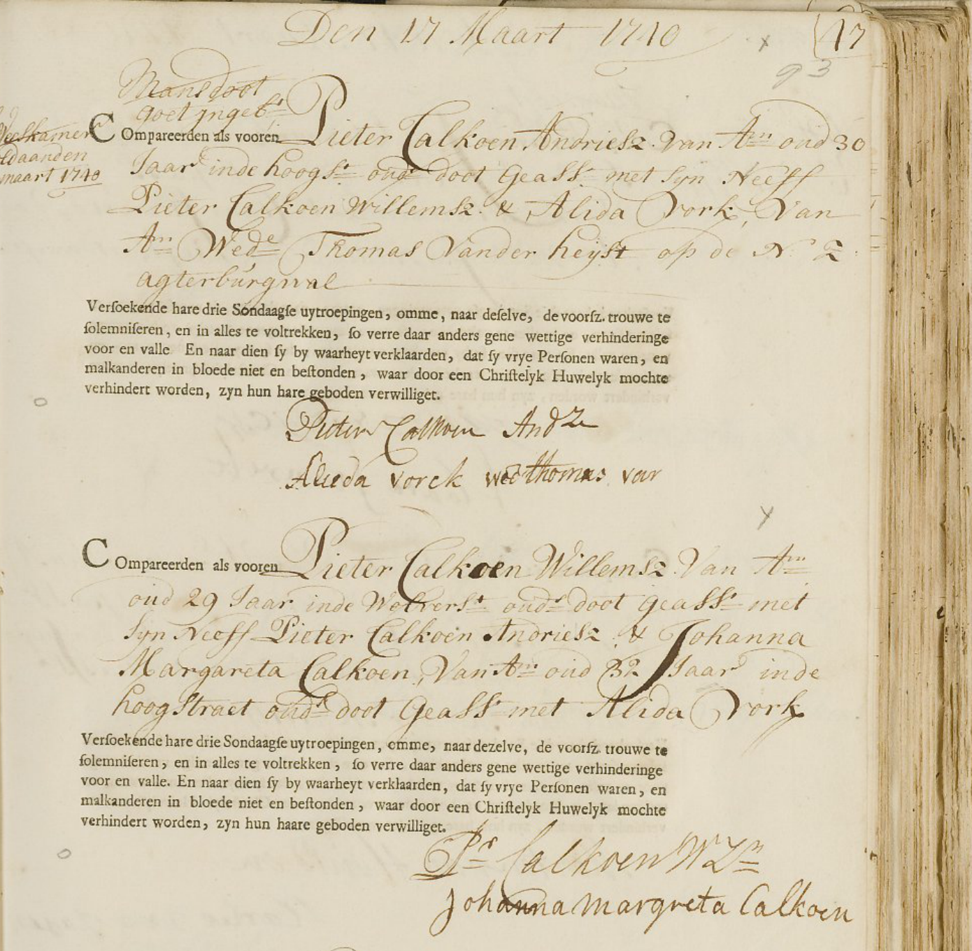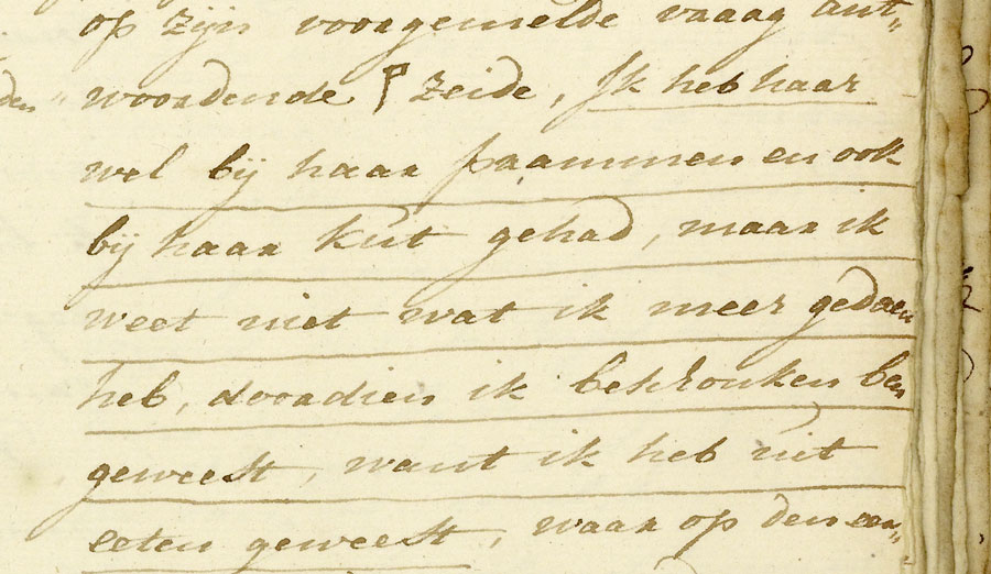 De volgende ochtend is hij wat bedaard en bekent hij Pieter Calkoen van de Keizersgracht te zijn. Hij vraagt nadrukkelijk om de geschiedenis stil te houden 'voor hem en zijn familie'. Vervolgens biedt hij duizend (!) guldens de zaak buiten de 'Heeren Regteren' af te handelen. De verdachte smeekt, bidt en huilt. De Kapitein van de nachtwacht belooft enige discretie maar geeft hem nog wel de les mee dat een heer van zijn fatsoen zich toch niet met het 'gemene canalje' in zou moeten laten. Hij zou immers niet alleen zichzelf maar ook zijn vrouw ongelukkig kunnen maken.