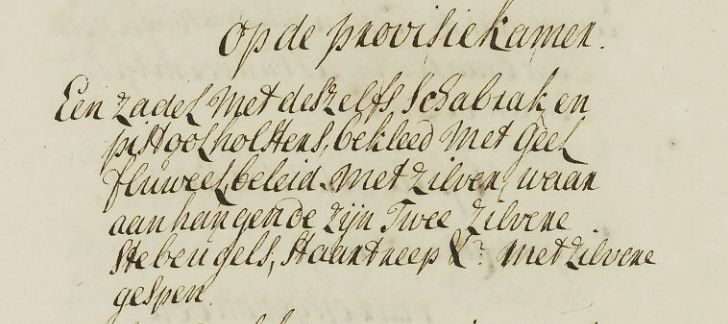 Fragmenten uit de boedelinventaris: onder meer wijn, een kostbaar zadel, een vergulde arrenslee en een schilderij van Gerard Hoed.