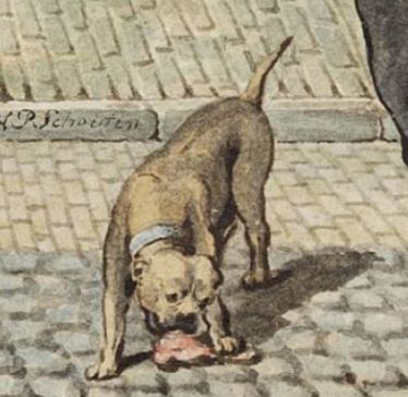 JW Kooistra vermaakte zich met de verklaring van Jan Horst, die op weg naar zijn werk, ter hoogte van de katoendrukkerij de Blauwe Engel op de Laagte Kadijk, twee ongemuijlbanden bulhonden op zijn pad vond.