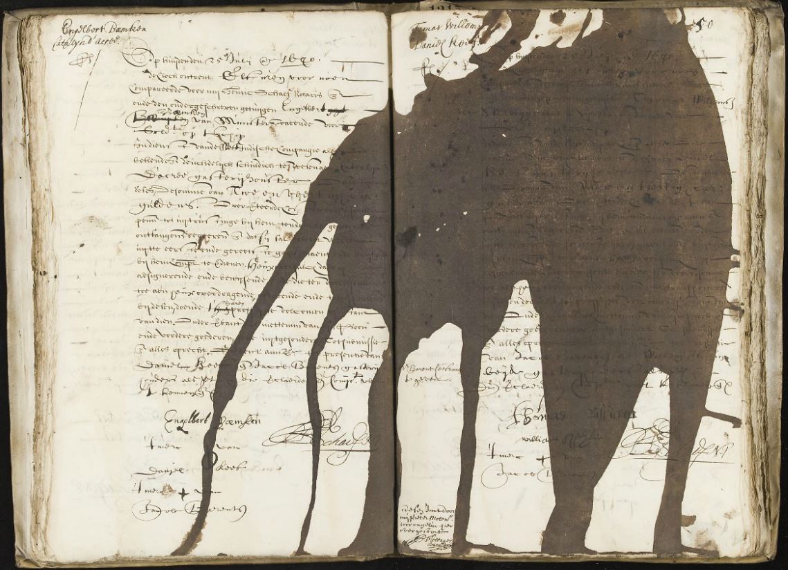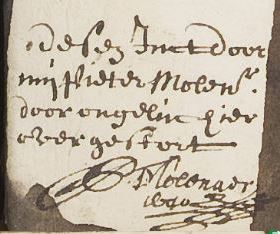 Nu hebben we ook een dader: Petra S spotte onderaan de bladzijde de bekentenis desen Inct door mij Pieter Molenaer door ongeluc hier over gestort. (1640)
