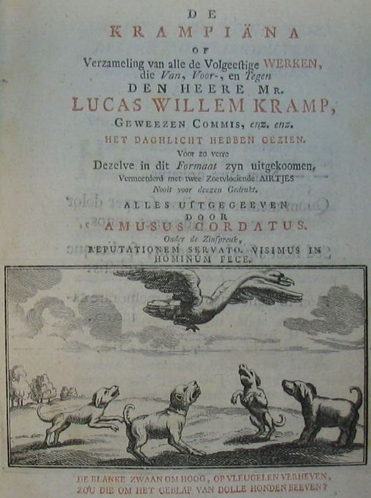 Na deze rel heeft Kramp nog veelvuldig van zich laten horen. Kramp blijft bij zijn beschuldiging van wanbestuur door Willem Sautijn - zelf ook niet vrij van onbesproken gedrag overigens - en May en richt zijn pijlen ook op ene Cannegieter en Rickers. Het bovenstaande plaatje komt uit Krampiana, een wonderlijke verzameling satirische geschriften voor én tegen hem met als auteursnaam 'Amusus Cordatus' (ca 1766). De afbeelding toont Kramp als zwaan met als honden o.m. Sautijn en May.