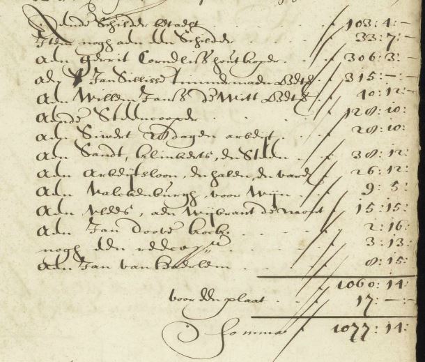 Terug naar Sloterdijk. Johannes laat niet alleen (ver)huurakten opstellen door zijn broer Simon. Zijn nevenfunctie als landeigenaar levert hem namelijk ook behoorlijk wat kosten op, die hij bij zijn broer laat optekenen. Zo verklaart hij in januari 1683 dat hij samen met Wijbrant de Mont een huis heeft gekocht, 'aen 't welcke sij comparanten hebben getimmert'. Samen geven ze aan welke kosten ze hebben gemaakt bij de verbouw van het huis. Steenkoper, glazenmaker of metselaar, er zijn veel mensen bezig geweest met het opknappen van de woning. De rekening bedraagt een ruime tweeduizend gulden.