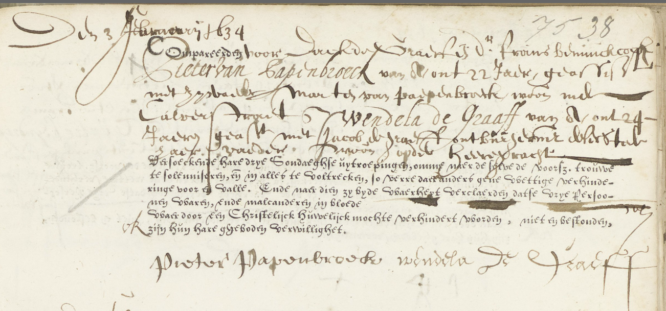 Alle bruidsparen uit het jaar 1633 en 1634 in Amsterdam zijn gelezen. Dit kon vrij vlot aangezien de meeste bruidegoms, de eerste regel uit de akte, binnen enkele seconden geëlimineerd konden worden als 'niet interessant'. We mogen aannemen dat de geschilderde jongeman, uit een vermogend milieu komt. Hierdoor vallen alle bruidegoms met een ambacht, varend beroep, soldaat etc. etc. direct af. De bruidegom woont in een groot huis, waar het schilderij gehangen moet hebben, en woont in een betere buurt. Alle adressen in sloppen en gangen vallen dan ook direct af. De bruidegom is in elk geval jonger dan 30 en hij kan een fatsoenlijke handtekening zetten en zijn bruid naar alle waarschijnlijkheid ook.