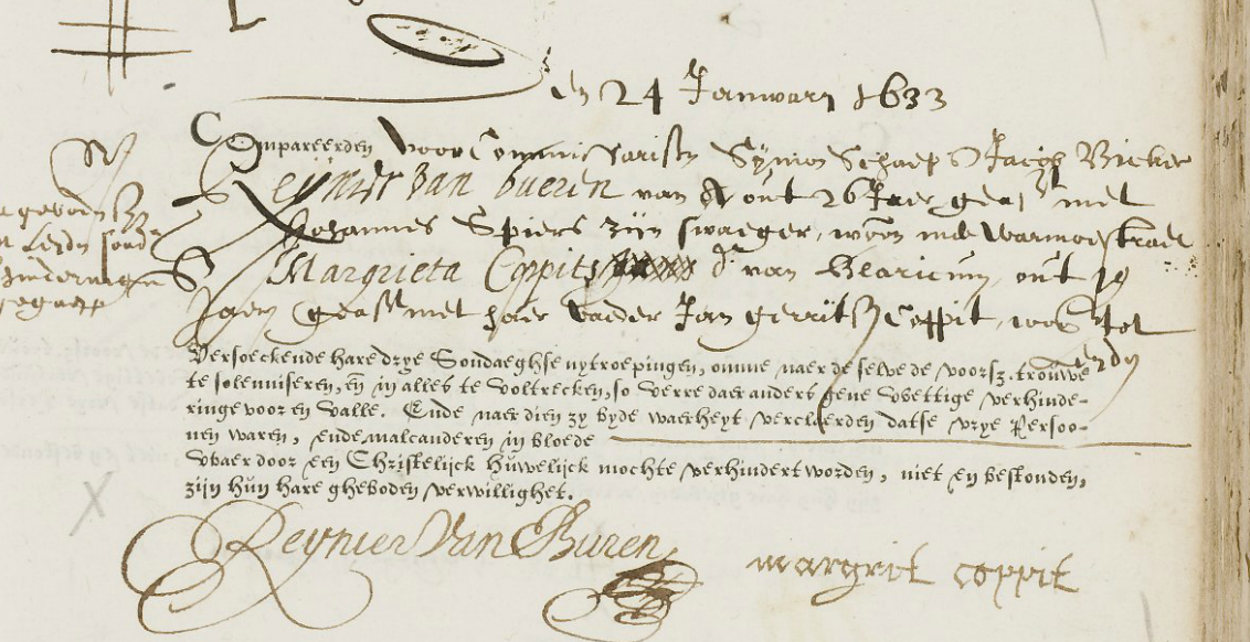 Het huwelijkscontract biedt geen uitsluitsel. Behalve het dopen van een aantal kinderen, heb ik via de Amsterdamse indexen nog geen verdere aanknopingspunten kunnen vinden rondom dit paar Reinier van Buren en Margriet Coppit. Uiteraard een interessant paar als portretkandidaten, wanneer haar zus Oopje door Rembrandt ter gelegenheid van het huwelijk geportretteerd werd, waarom Margriet dan niet? In de RKD databank vond ik een interessant 'portret van een jonge vrouw' van Rembrandt uit 1633 wat een sterke gelijkenis vertoont met Oopje. Zou het haar jongere zus Margriet kunnen zijn? Het is volgens de gegevens op de rkd-site geschilderd op een paneel – het kan dan m.i. niet het andere deel van het uitgeknipte portret van onze gezochte jongeman zijn, wat op doek geschilderd is, een jaar later in 1634.