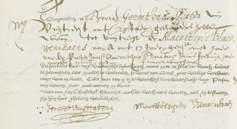 Uit de boedel blijkt dat er een zoon Gerard van Straten bestaat, waarvan de doop niet in Amsterdam te vinden is. Vanwege de herkomst van Gerrit, uit Utrecht, was het een kleine moeite de doop van deze Gerard in Utrecht terug te vinden, op 14-11-1637. Soms helpt het geluk een handje mee, bij zo'n onderzoek, want al zoekende naar alle spellingvarianten van Gerard van Straten in het Utrechts archief vond ik al snel een testament, opgemaakt op 25-01-1638, van hem en Machteltje, waarmee zijn beroep bekend word: apotheker. Ook blijkt zijn broer uit dit document: Willem/Guilliaum van Straten/Stratenius. De doop/geboorte van bruidegom Gerrit is helaas niet teruggevonden, maar gezien de leeftijd van zijn broer, geboren in 1593, lijkt het meer aannemelijk dat hij 29 was bij zijn huwelijk in 1634 (dus geboren rond 1605) dan 20 (1614).