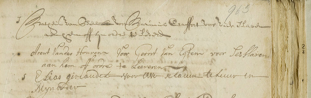 De bovenstaande bon is voor een levering op 13 juli 1705 van zes Afrikanen die met het schip de Juffrouw Christina naar Suriname vervoerd zijn. De zes Afrikanen werden voor 1500 gulden verkocht aan Gerrit van Egten, dat bedrag werd voldaan door zijn zaakwaarnemer in Amsterdam Arend van der Hoeven. De zes Afrikanen maakten onderdeel uit van een bestelling op 11 januari 1705 van 136 'negros slaven'. Zowel de bestelling als de latere afrekening vonden plaats in het bijzijn van notaris Stephanus Pelgrom, die naast zijn notarispraktijk ook secretaris van de Sociëteit Suriname was.