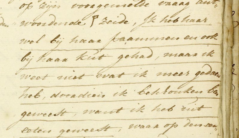 De volgende ochtend is hij wat bedaard en bekent hij Pieter Calkoen van de Keizersgracht te zijn. Hij vraagt nadrukkelijk om de geschiedenis stil te houden 'voor hem en zijn familie'. Vervolgens biedt hij duizend (!) guldens de zaak buiten de 'Heeren Regteren' af te handelen. De verdachte smeekt, bidt en huilt. De Kapitein van de nachtwacht belooft enige discretie maar geeft hem nog wel de les mee dat een heer van zijn fatsoen zich toch niet met het 'gemene canalje' in zou moeten laten. Hij zou immers niet alleen zichzelf maar ook zijn vrouw ongelukkig kunnen maken.