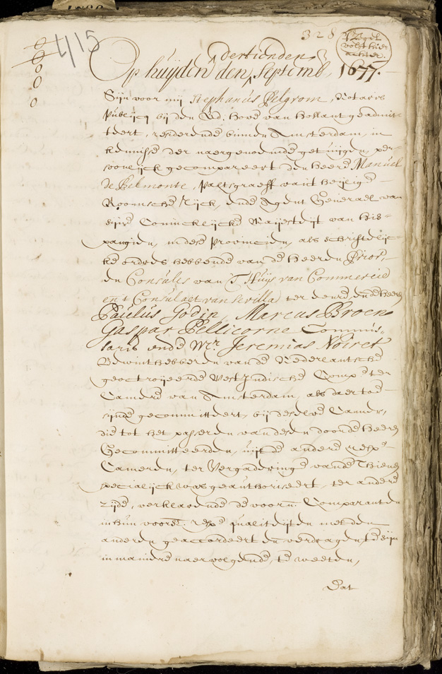 Persoonlijk verschenen voor mij (notaris Stephanus Pelgrom) de heer Manuel de Belmonte, paltsgraaf (een adelijke titel) van het Heilige Roomse Rijk en agent generaal (iemand die uit naam van de koning toezicht houdt op immigratie) van zijne koninklijke majesteit van Spanje in deze provincie. Met schriftelijke orders van de heren Prior en Consules van het handelshuis en het consulaat van Sevilla aan de ene zijde. En de heren Paulus Godin, Marcus Broen, Gaspar Pellicorne, commissaris, en Jememais Noiret, bewindhebbers van de Nederlandse West-Indische Compagnie van de Amsterdamse Kamer (aan de andere zijde)