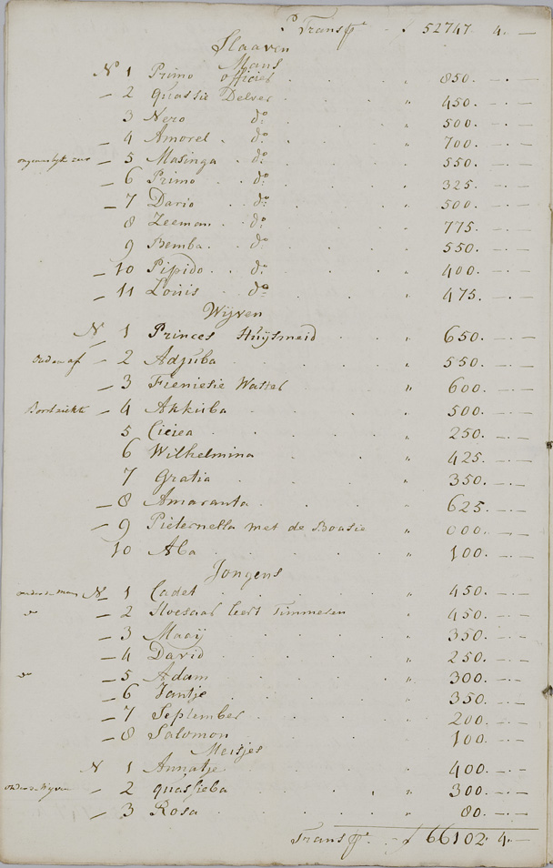 Achter elke tot slaaf gemaakte staat de waarde vermeld. Officieren waren het meeste waard, terwijl slavin Pieternella volgens deze taxatie niets waard was omdat zij aan “boasie”, lepra, leed.