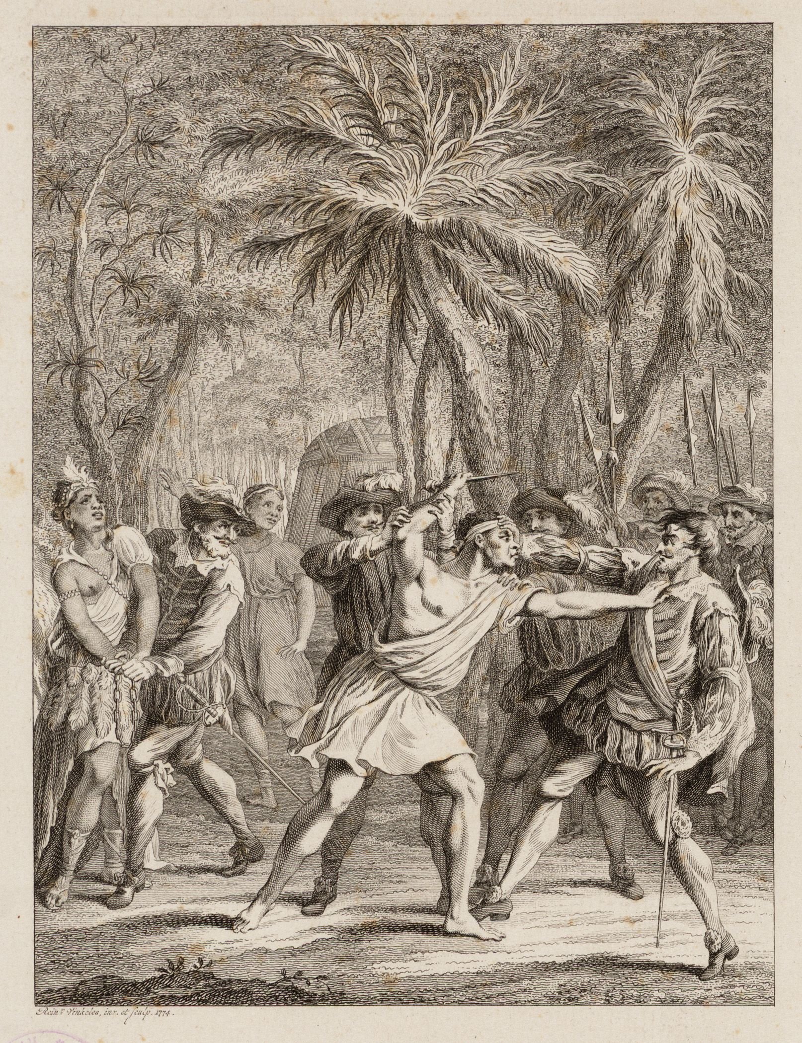 Afbeelding: prent van het treurspel “Monzongo, of de koninklijke slaaf”, 1774. Toneelstuk naar aanleiding van de Slavenopstand in Berbice.