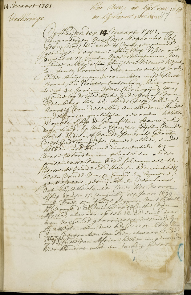 Op 15 augustus 1699 zeilde het schip weg van Texel naar het kasteel Sint George in El Mina op de kust van Afrika, waar het op 12 december aan kwam. Waarna het schip naar Fida vertrok. Daar en verder aan de kust van Afrika hebben ze vierhonderd achtentachtig pesos…