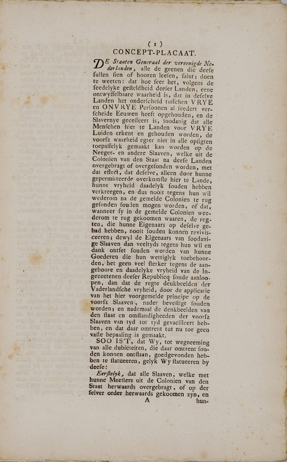 Op Nederlandse bodem was slavernij verboden. Het bestond alleen in de Nederlandse koloniën. Dit onderscheid leek duidelijk en helder. Er ontstonden echter moeilijkheden wanneer plantage-eigenaren tot slaaf gemaakten wilden meenemen als zij voor korte tijd in Nederland verbleven. Ook zij die van plantages vluchtten en als verstekeling in Nederland arriveerden, waren volgens de strikte regeling vrijen. Daarom werd in 1776 deze resolutie gepubliceerd waarin alle mogelijke scenario’s van Surinaamse onvrijen in het vrije Nederland werden gespecificeerd.