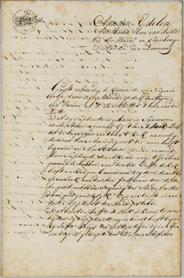 Zij supliante (Caatje) is geboren in Suriname en is slavin geweest bij de heer Jan de Bok. De huisvrouw van de heer de Bok na het overlijden van haar man in Amsterdam ging wonen, Caatje meegenomen, wie na enige tijd daar gewoond te hebben van dezelfde juffrouw de Bok haar brieven van vrijheid kreeg. Welke op verzoek van dezelfde juffrouw de Bok door de edelgrootachtbare regering van de stad Amsterdam zijn gegeven.